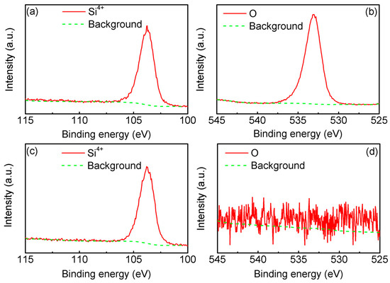 Figure 2a,b shows the elements (Si and O) distribution and valence states on the surface of the thermal oxidized single-crystalline silicon plate before etching. The results show that the Si element had only a Si4+ valence state of a Si 2p orbital (103.8 eV), and the O element had only one peak (532.9 eV). The binding energy of the Si–O bond was consistent with that reported in the literature [26,27]. Since the thermal oxidation process of the single-crystalline silicon plates was carried out in an oxygenated atmosphere, Si4+ could not be reduced to low-valence ions at high temperature. According to the atomic content distribution obtained by XPS analysis, the contents of the Si and O elements on the surface of the Si sheet before etching were 30.83% and 57.9% (that of C was 11.27%, not shown here), respectively, which further demonstrated that a layer of SiO2 was generated on the surface of the Si plates after thermal oxidation. When Ar ion etching was used (the etching voltage was 2 kV, etching rate of the SiO2 was about 0.14 nm/s [28]) after the etching of 220 s, the surface O element was almost impossible to detect, as shown in Figure 2d. Here, the contents of the Si and O elements on the surface of Si plates were 89.25% and 0.5% (that of C was 10.25%, not shown here), respectively.