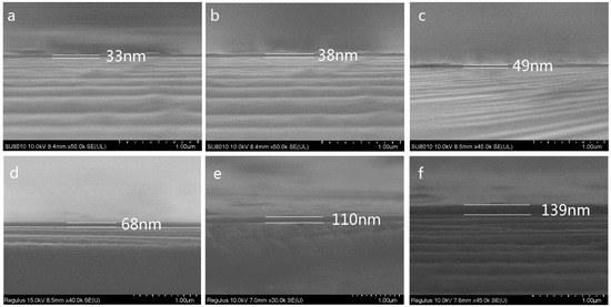 The thickness of the etched SiO2 layers was derived from the product of the etching rate (0.14 nm/s) and etching time (220 s). Therefore, the thickness of the SiO2 obtained after 3 min of thermal oxidation was approximately 30.8 nm. Deal et al. [22] reported the relationship between the thickness of SiO2 layers generated by the thermal oxidation of Si plates and the thermal oxidation time, and the corresponding SiO2 thickness was similar to the results we measured. According to the thickness of the single-crystalline silicon plate after thermal oxidation for 3 min, we could evaluate the thickness of other thermal oxidation samples for 5 min, 10 min, 20 min, 40 min, and 1 h, respectively, i.e., 35 nm, 48 nm, 70 nm, 104 nm, and 131 nm. These evaluated SiO2 thicknesses were confirmed by the SEM cross-section pictures seen in Figure 3. Figure 3 shows the cross-section SEM images of a single-crystalline silicon plate (thickness 0.7 mm, resistivity 0.001 Ω∙cm) that underwent thermal oxidation for various times in the O2 atmosphere. The SiO2 layer thickness of the thermally oxidized silicon plates increased with the increasing thermal oxidation time. From Figure 3, we could evaluate the thickness of thermal oxidation samples for 3 min, 5 min, 10 min, 20 min, 40 min, and 1 h, respectively, i.e., 33 nm, 38 nm, 49 nm, 68 nm, 110 nm, and 139 nm.