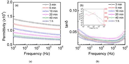Figure 4 shows the dielectric permittivity and dielectric loss of the single-crystalline silicon plates (thickness 0.7 mm, resistivity 0.001 Ω·cm) that underwent thermal oxidation for various times in the O2 atmosphere. The dielectric permittivity of the thermally oxidized silicon plates decreased with the increasing thermal oxidation time. It was easy to understand that the thickness of the SiO2 generated at the top and the bottom of the silicon plates increased as the thermal oxidation time increased. According to our recent work [20], we found that the dielectric constant was inversely proportional to the thickness of the insulator in the ISI structure (seen in Figure S2 in Supplementary Files). The maximum dielectric permittivity (~1.4 × 104) of the thermally oxidized silicon plates for 3 min was approximately two times higher than that of the thermally oxidized silicon plates for 1 h (~0.75 × 104). The CP varied within 15% with frequency (100–106 Hz) and independent of the temperature (100–250 K, seen in Figure S3 in Supplementary Files). The dielectric constant of all of the thermally oxidized silicon plates were enhanced more than that of the intrinsic single-crystal silicon plates (~11.9 [29]). The measured dielectric loss of the samples with different thermal oxidation times had no relationship with thermal time on the whole, which decreased with increased thermal oxidation time. The dielectric losses of the all samples were below 0.06 over most of the measured frequency range (102–106 Hz), and the minimum dielectric loss was 0.02 (at 104–105 Hz) for the thermally oxidized silicon plates for 1 h. Compared with that of the raw Si wafer (the inset of Figure 4b), the dielectric constant and dielectric loss of all of the thermally oxidized silicon plates were decreased greatly because the carriers were concentrated on the top and the bottom surfaces of the silicon plates due to the SiO2 generated by thermal oxidation, thus no large leakage current was generated, preventing large dielectric loss.