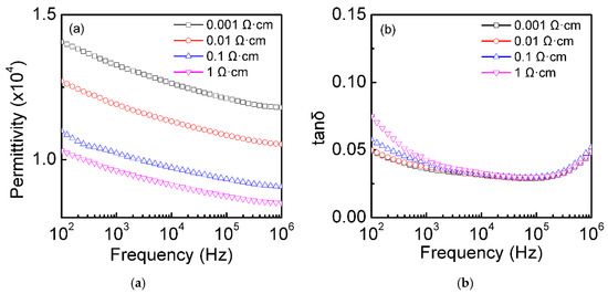 To further study the effects of different resistivity on the dielectric properties of the silicon plates after oxidation, the dielectric permittivity and dielectric loss of the thermal oxidized Si plates (thickness 0.7 mm) with different resistivity at room temperature were assessed, as shown in Figure 5. The CP of the thermally oxidized silicon plates decreased with the increase of the resistivity. It was easy to understand that the larger the resistivity of the single-crystal Si plates was, the lower the internal carrier concentration was, which was very crucial to the polarization [20]. The maximum dielectric permittivity at 105 Hz (~1.23 × 104) was obtained when the resistivity of the silicon plates was 0.001 Ω·cm. The measured dielectric losses of the 0.001 Ω·cm resistivity sample were below 0.06 over most of the measured frequency range (102–106 Hz), and the minimum dielectric loss was 0.03 (at 2 × 104–105 Hz). The CP and dielectric loss changed slightly in the whole frequency range (102–106 Hz), indicating that the dielectric properties of the thermal oxidized single-crystal Si plates with different resistivity had better frequency stability.