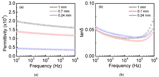 here, ɛ0 was the absolute dielectric constant and S was the surface area of the top and bottom surfaces’ electrodes of the thermally oxidized single-crystalline silicon plates, C was the capacitance, and d was the thickness of the single-crystal silicon plates. Usually, C decreases with the increasing of d, and as a result, ɛr keeps a constant. It was interesting that the ɛr of the thermally oxidized Si plates was dependent on d (the thickness of the Si plates). Figure 6 shows the dielectric permittivity and the dielectric loss of the single-crystalline silicon plates (different thicknesses) thermally oxidized in an O2 atmosphere. The dielectric permittivity of the silicon plates increased with the increase of Si plate thickness, and the maximum dielectric permittivity at 100 Hz (~1.95 × 104) obtained in the 1.0 mm thick Si plates was approximately 4.2 times higher than that (~0.46 × 104) of the 0.24 mm thick Si plates, which was due to the measured C that had almost no large change with different thicknesses. This may have been attributed to the large carrier concentration that was plenty big enough for the polarization, which was not dependent on the single-crystalline silicon plates (different thickness). Furthermore, the CP was almost independent of the frequency (100–106 Hz). The measured dielectric losses of the 1.0 mm sample were below 0.07 over most of the measured frequency range (102–106 Hz), and the minimum dielectric loss was 0.04 (at 104–105 Hz). Similarly, the CP and the dielectric loss changed slightly in the whole frequency range (102–106 Hz), indicating that the dielectric properties of the single-crystal Si plates with different thicknesses after thermal oxidation had better frequency stability.
