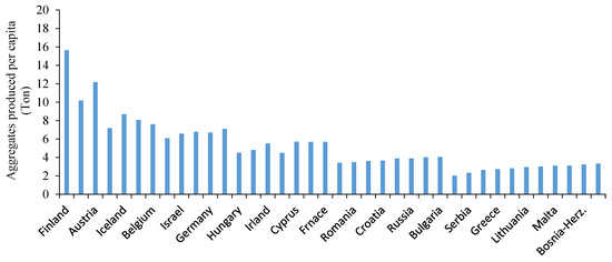 Nowadays, it is well known that preparing natural aggregates for concrete production—due to carbon dioxide consumption—is a severe threat of environment and should be logically minimized. On the other hand, the construction and demolition waste (CDW) in countries is growing. In this regard, little more than half a billion tons of annual waste generated in Europe, this amounts to 325 million and 77 million tonnes for the US and Japan respectively. Considering that China and India are now producing and using over 50% of the world’s concrete, as development continues their CDW will be important too [1,2]. It was reported by UEPG (European Aggregates Association) that aggregates consumption for producing of concrete was 2.5 billion tonnes in 2013. Figure 1 illustrates the tonnes of aggregates produced per capita by countries. As shown, Finland produced about 16 tonnes per capita which ranks as the top producer amongst EU countries [3].