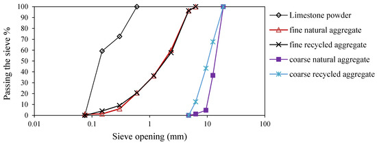 As given in Table 1, the water absorption of coarse and fine recycled aggregates is 316% and 109% more than that for natural ones, respectively. Furthermore, the abrasion resistance of recycled aggregate is 164% lower than the natural coarse aggregate. These results, which are due to the adhered mortar, are in agreement for the results obtained by other researchers [37,38], and are most likely to conform to EN1097-6, reporting the physical properties of natural and recycled aggregates [39]. The gradations of coarse and fine aggregate and limestone powder are shown in Figure 2.