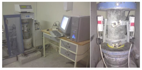 Compressive strength stress-strain tests were performed at the age of 28 days on 100 × 200-mm cylindrical specimens. For this purpose, three capped samples were used in order to use their mean to plot stress-strain curves. Figure 3 shows the setup instruments for stress-strain measuring: compression machine of ADR 2000 KN (ELE Company, England, UK), strain gauge, and data logger.