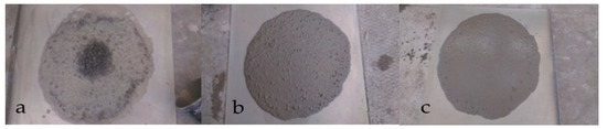 Several trial and error efforts were made for preparing the convenient SCC mixtures. It was found that to avoid bleeding and segregation in concrete mixtures prepared with recycled aggregates, AEA and silica fume must be used (Figure 4a–c). This important finding is surely an effective guidance contractors to prepare SCC mixtures made by fine and coarse RCAs.