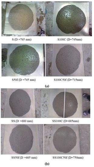 Slump flow tests (a) concrete mixtures series I, and (b) concrete mixtures series II.