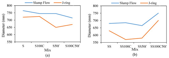 Slump test flow diameter and J-ring flow diameters (a) series I, and (b) concrete mixtures series II.