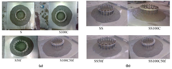 J-ring test (a) concrete mixtures series I, and (b) concrete mixtures series II respectively.