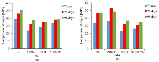 The results of compressive and tensile strength are shown in Table 4. As given the compressive strength of S100C, due to the replacement of 100% coarse RCA, diminished by 38.5%, 30.7%, and 25.2% compared to reference sample S, respectively, at the age of 7, 28, and 91. Moreover, the replacement of 50% of fine RCA in S50f has reduced compressive strength by 27.1%, 24%, and 30.6% at the age of 7, 28, and 91 days, respectively. The results indicate that the simultaneous use of fine and coarse RCA in S100C50f led to a reduction of compressive strength by 22.7% at the age of 91 days (Figure 8a). It is noteworthy that air entraining agent is normally responsible for compressive strength reduction; however, the rule of this admixture on strength of recycled aggregate concrete is not so clear. Similar results were obtained by other researchers. They found that the main reasons for strength reduction were attributed to the higher porosity of recycled aggregate and the weak aggregate-matrix interface bond between recycled aggregate and mortar [40]. On the contrary, in series II, the compressive strength of SS100C increased by 6.5%, 14%, and 28%, compared to SS sample at the ages of 7, 28, and 91 days, respectively. This result revealed the advantage effect of silica fume when used as a replacement for cement. The other researchers also showed that utilization of mineral admixtures—like fly ash, silica fume, and ground granulated blast furnace slag—in the mix proportions led to an increase of compressive strength [41,42,43]. The results also showed that the compressive strength of SS50f mixture at the ages of 7, 28, and 91 days was decreased by 31.6%, 29.9%, and 22.1%, respectively. The result declared that the compressive strength of SS100C50f, which contained simultaneously coarse and fine recycled aggregates, reduced about 26.6% at the age of 91 days (Figure 8b).