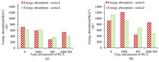 The stress-strain test results at 28 days are given in Table 5. Some properties, including the proportional strain test (peer), the maximum stress and the final strain, the energy absorbed in the intervals and and the MOE are also given in Table 5. The results showed that in all recycled concrete mixtures, with the replacement of recycled aggregates, the energy absorption in the interval has decreased compared to the reference samples (Figure 10a). In the interval , the energy absorption decreased by replacing recycled aggregates except for S100C (Figure 10b).