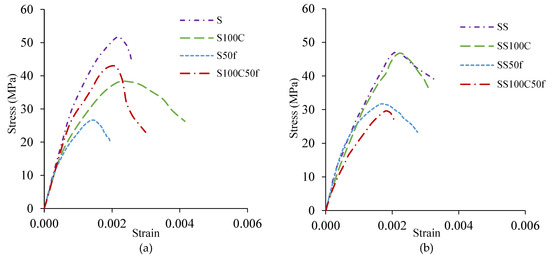 In Figure 11a, the stress-strain relationships of Series I specimens are shown. By replacing recycled aggregates, the modulus of elasticity (MOE) has decreased compared to the reference sample S. By replacing 100% coarse RCA, MOE has decreased by 14% and by replacing 50% of the fine RCA, the MOE has declined by 22%. The MOE was also reduced by 10% in S100C50f, by combining fine and coarse recycled aggregates.
