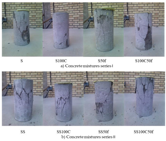 Failure pattern of mixtures in compressive stress, (a) Series I and (b) Series II.