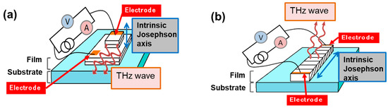 Schematic drawing of intrinsic Josephson junction devices for THz emission: (a) Mesa-type using c-axis high temperature superconductors (HTS) oriented film; (b) Planar-type using non c-axis HTS oriented film.