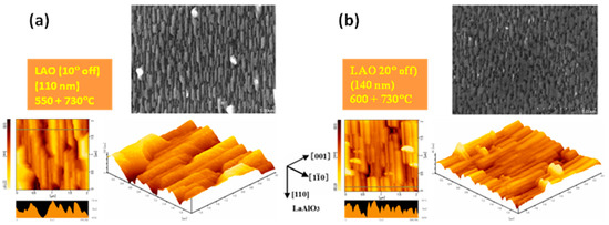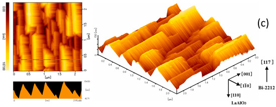 Although the twins do not form, the morphology of the grains from the non c-axis thin films of Bi-2212 on vicinal substrates resembles the span roof-like shape for the flat substrates (Figure 8). When compared to the film on the flat substrate (Figure 5), use of the vicinal substrate (|α| = 10°) in the two-temperature growth approach for constant growth conditions (550 + 730 °C) resulted in the decrease of the grains width (Figure 8a). A higher uniformity and a smaller roughness are obtained for a vicinal substrate with a larger off angle (|α| = 20°) (Figure 8b) and for a higher growth temperature in the first step of growth (550 + 730 °C) (compare Figure 8b with a). These improved features are necessary for fabrication of IJJ-THz devices, and have also a positive practical meaning if integration is required. The result can be understood considering the smaller width of the terraces and their higher density (suppressing random nucleation) for a vicinal substrate with a higher |α|. As in the case of the flat substrates, films on vicinal substrates according to AFM and SEM images (Figure 8) are aligned in-plane. Considering also structural data, we conclude that our films on vicinal substrates are twin-free 3D epitaxial thin films.