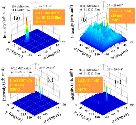 XRD φ-ψ scans for the (a) (110) LaAlO3 (LAO) substrate (110) plane, 2θ = 33.4°) and (b–d) non c-axis Bi-2212 thin films (0010) plane, 2θ = 29.048°) obtained for different growth temperatures on different vicinal substrates. Positions (ϕ, ψ) of the peaks in (a–d) are: (81°, −10°), (90°, 37°), (90°, 36°), and (91°, 25°), respectively.