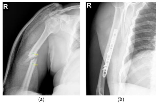 - Pidhorz, L. Acute and chronic humeral shaft fractures in adults. Orthop. Traumatol. Surg. Res. 2015, 101, S41–S49. [Google Scholar] [CrossRef]