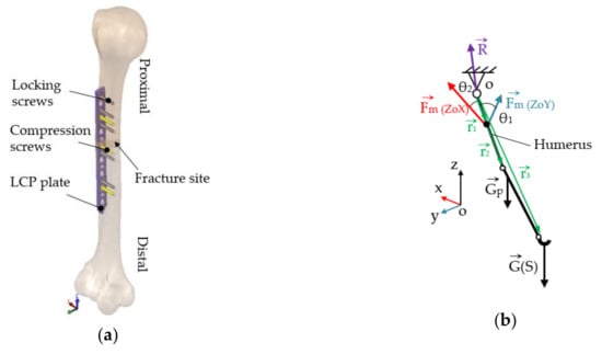 Geometric assembly and simplified static model: (a) Reconstructed humerus and LCP system fixed in place—internal lateral view; (b) Simplified body diagram of the upper limb used for computation of muscle forces.