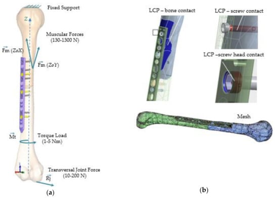 Structure loadings, constrains and contacts applied to the FEA model (all scenarios): (a) Loadings and boundary conditions; (b) Bonded contact definition: bone-plate, screw-plate, and screw-bone.