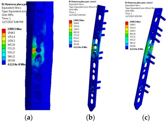 Stress distribution within the LCP when a 5 Nm torque is applied—rotation movement tendency: (a) Lateral view, bone-plate; (b) Lateral-front view, plate-screws; (c) Lateral-back view, plate-screws.