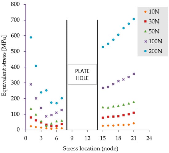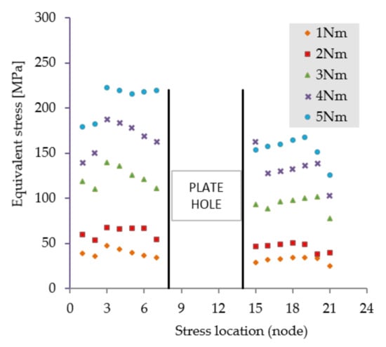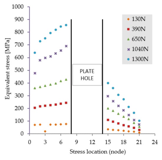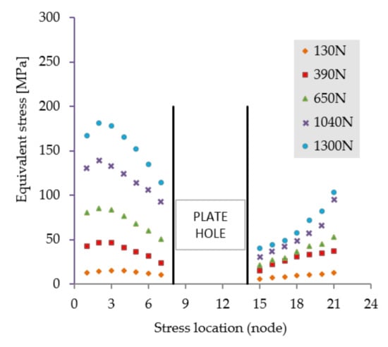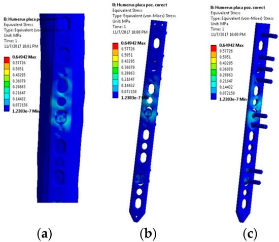 The first scenario implies a flexion tendency of the humerus by activation of the anterior deltoid muscle, while at palm level the following weights are acting discretely: 1, 3, 5, 8, and 10 kg. The stress distribution presented in Figure 5 reveals high stresses at the hole positioned in the immediate vicinity of the bone fracture. Regardless of the weight values input, the insertion and direction of loading, together with the complexity of the assembly [41,42], cause a non-uniform and asymmetric stress distribution to appear in the plate. The plate is subjected to bending. Depending on loading values, von Misses stresses vary in magnitude according to the plot shown in Figure 6.