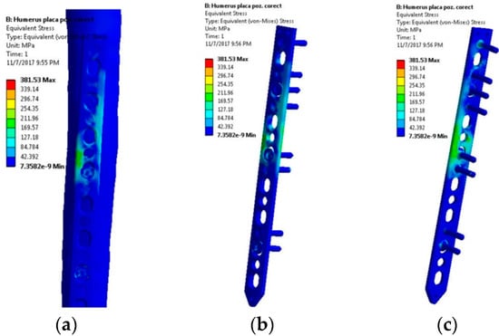 Stress distribution within the LCP when a 10 kg mass is lifted—abduction movement tendency: (a) Lateral view, bone-plate; (b) Lateral-front view, plate-screws; (c) Lateral-back view, plate-screws.