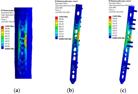Implant performance could be influenced by factors like the failure of the surgical procedure, such as plate fixation [11]; deviations from the physician prescription; high loads and high physical activity; interaction between the implant and the biological system; the material of the implant and screws, which can lead to inflammation followed by failure [12]; the design and length of the screws [13]; and the configuration of the screws with respect to the palate [14]. The number of free holes that the plate possesses at the end of the surgery can negatively influence the loading capacity of the system, due to the stress concentration effect that a free hole induces in the plate [15,16]. Also, the anatomical positioning of the implant and its geometry, together with the fixing procedure [17], can enhance system durability. Usually, failure of the implants occurs in the first three postoperative months, in 1–4% of the cases [18], due to complex mechanical and biological factors that generate corrosion [19]. Yet, one of the major complications of plate fixation is represented by a radial nerve injury. The radial nerve is vulnerable both during initial exposure and during the placement of the cortical screws. In addition, several authors [20] have reported neuropraxias attributed to excessive traction during fixation of the fracture. In all cases, these injuries were temporary and healed fully.