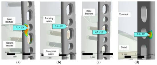 The minimum cycles to failure occurred naturally in the section of high stresses, which are currently in the vicinity of the plate hole that is located near to the bone fracture site. The equivalent elastic stress obtained by static simulation and the critical areas indicated by fatigue analysis are validated by the visual and fractographic examinations (Figure 14 and Figure 15). The failure occurs in the same spot as the simulation predicts.