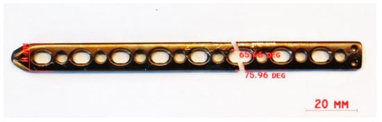 The retrieved implant is shown in Figure 14. This was measured using a digital caliper, resulting in the following overall dimensions: 11 mm width × 2.8 mm thickness × 133 mm length.