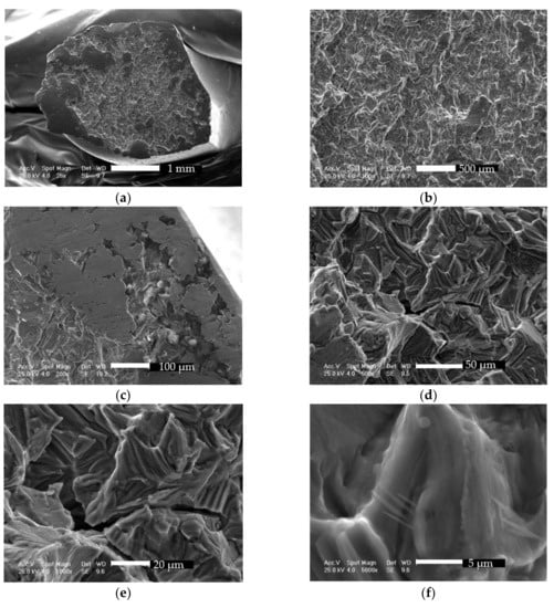 The center region, inspected at different magnifications (Figure 17b,d), reveals intercrystalline and transcrystalline fracture features, specific to fatigue failures in titanium [48,49], along secondary cracks. The feather markings, an array of fine cleavage steps on cleavage facets pointing back in the direction of the local crack, can be clearly seen in Figure 17e,f.