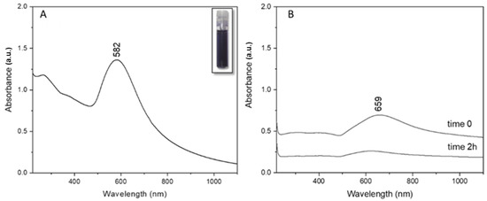 Post synthesis, the UV-Vis absorption profile of clg-AuNPs was registered (Figure 2A). The clg-AuNPs have a maximum of absorption at 582 nm, which correlates directly with the colloid’s deep blue color, as shown in the inset of Figure 2A. The plasmon band is significantly shifted towards higher wavelengths compared to the absorption maximum of common spherical gold colloids at around 520 nm [16], suggesting that the clg-AuNPs might have a bigger size and anisotropic shape.