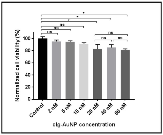 Figure 5 shows HeLa cellular viability as a function of clg-AuNPs concentration. HeLa cells were incubated with nanoparticles at concentrations ranging from 5 nM to 60 nM. The groups were statistically analyzed using one-way analysis of variance (ANOVA), employing Tukey correction for multiple comparisons between groups using statistical hypothesis testing. The reported p values are multiplicity adjusted to account for multiple comparisons, with the family-wise significance and confidence level set at 0.05 (95% confidence interval).