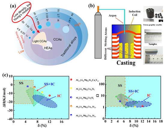 Composition design and synthesis of the ultralight-weight complex concentrated alloys (ULW-CCAs). (a) Schematic of material design. (b) Casting process. (c) Phase constituent prediction maps (the relationship between parameters of δ, ∆Hmix, and Ω.