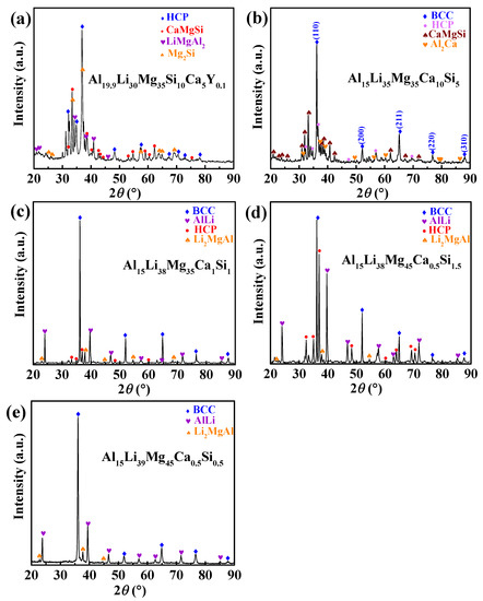 X-ray diffraction patterns of five ULW-CCAs. (a) Al19.9Li30Mg35Si10Ca5Y0.1 ULW-CCA; (b) Al15Li35Mg35Ca10Si5 ULW-CCA; (c) Al15Li35Mg48Ca1Si1 ULW-CCA; (d) Al15Li38Mg45Ca0.5Si1.5 ULW-CCA; (e) Al15Li39Mg45Ca0.5Si0.5 ULW-CCA.