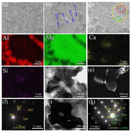 According to Figure 3, the Al15Li38Mg45Ca1Si1 ULW-CCA has a good comprehensive property, i.e., the high strength accompanied by the good ductility. Thus, the microstructure of the Al15Li38Mg45Ca1Si1 ULW-CCA is further characterized. The BSE images of the Al15Li38Mg45Ca1Si1 ULW-CCA are shown in Figure 5a–c. The EDS maps are also given in Figure 5. The microstructure consists of the matrix (region A in Figure 5b), the lath-like phase (region B and region C in Figure 5b), and submicron-size particles (region D in Figure 5b). Based on the EDS map, the lath-like phase (region B) is an Al-enriched phase (Table 3). Combined with the X-ray result of this CCA (Figure 2c), the TEM observation indicates that the lath-like phase could be referred as the AlLi phase (Figure 5d–f), and region D is the Li2MgAl phase (Figure 5b). The size of the AlLi phase is 5–20 μm. The matrix is the BCC phase that is determined by the selected-area electron diffraction (SAED) pattern (Figure 5h) In addition, some submicron-sized particles with the HCP structure (Figure 5b,c) are embedded in the BCC structure matrix and are surrounded by the lath-like Al-Li and Li2MgAl phases (Figure 5c).