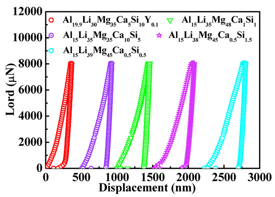 Nanoindentation tests were carried out to characterize the hardness and Young’s modulus of different phases in the ULW-CCAs. Considering that the measured area of the nanoindentation test is localized in a very small region with a diameter of several hundred nanometers, the hardness, and elastic modulus values must be very scattering. Furthermore, because the nanoindentator tip touching the area usually can slightly deviate from the target area during the experiment, the nanoindentation tests for each ULW-CCA were repeatedly carried out to exclude the odd values. In our study, the nanoindentation tests were repeated ten times to exclude the occasional result. The load-displacement curves of the nanoindentation tests for each ULW-CCA are representatively shown in Figure 6. Based on the load-displacement curve, the hardness and Young’s modulus values are evaluated [37].