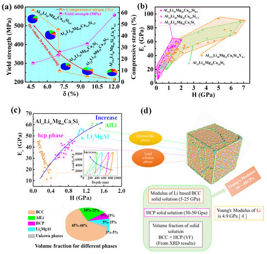 (a) Relationship between yield strength, compressive strain, volume fractions of solid-solution phases and δ (%). (b) Young’s modulus as a function of hardness for five ULW-CCAs. (c) The relationship between Young’s modulus and hardness for different solid-solution phases and intermetallic compounds. (d) Structure model of the Al15Li35Mg48Ca1Si1 ULW-CCA.