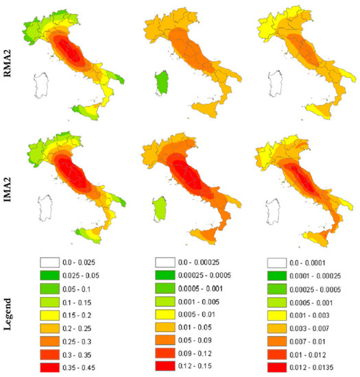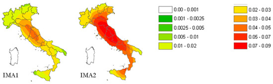 Italian risk maps of the annual damage factor for masonry buildings with (IMA1) and without (IMA2) tie rods and/or tie beams [23].