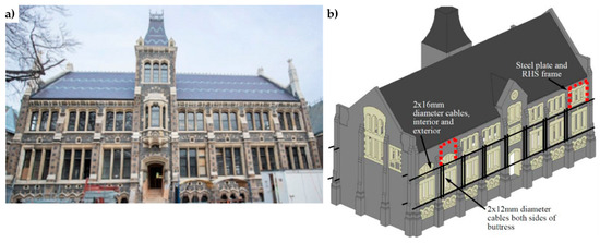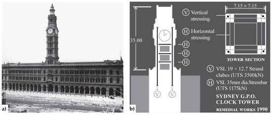 The General Post Office (GPO) Tower (Sydney, Australia): (a) external overview of the GPO façade; (b) strengthening scheme with the internal horizontal and vertical tie-bars [22].