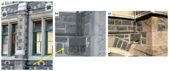 During the 2010/2011 Canterbury earthquake sequence, the actual effectiveness of post-tensioning unreinforced masonry (URM) was demonstrated by the performances of the Chemistry (Figure 5) and College Hall buildings—two stone masonry buildings within The Arts Centre of Christchurch (New Zealand)—which received post-tensioned seismic retrofits in 1984 [44]. Although the retrofits were subject to considerable budgetary constraints and both pre-stress losses and corrosion had decreased the efficiency of the retrofit system after 26 operating years, the post-tensioning succeeded in improving the in-plane and out-of-plane wall strength significantly and limiting residual wall displacements. Consequently, the original post-tensioning system was renewed and reinstated after the seismic sequence, this time using steel cables (Figure 6) in order to avoid corrosion phenomena.