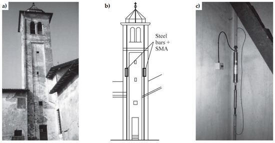 The bell tower of the church of San Giorgio in Trignano (Italy): (a) external view; (b) strengthening scheme; (c) detail of the coupling between Shape Memory Alloy (SMA) and a vertical steel tendon [22].