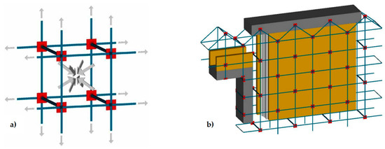 (a) Hinged mechanism between the ribbons of the rectangular arrangement of the CAM system; (b) Out-of-plane loading of a wall reinforced by the CAM system [52].