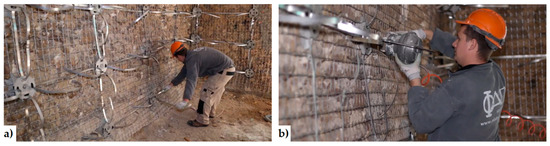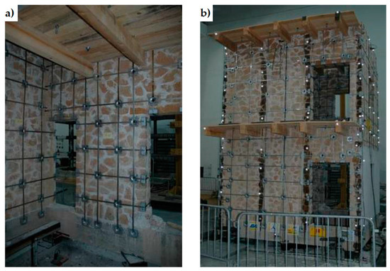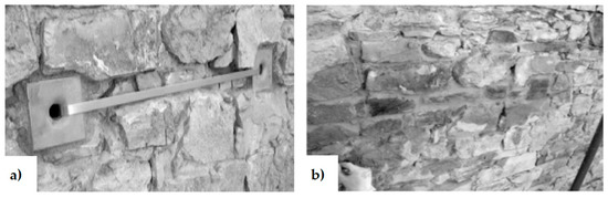 The active confinement provided by the straps compacts the masonry wall and, if the wall is double layered (Figure 8b), improves the transversal links between the vertical layers. It is worth noting that also masonry jacketing—made of shotcrete and light steel net reinforcement—is suitable for connecting the vertical layers of a double-layered wall. Nevertheless, jacketing is a passive strengthening and, as such, suffers all the typical drawbacks of a passive reinforcement (discussed in Section 2.1). Moreover, it is preferable to avoid the use of concrete in old masonry buildings, to eliminate deformation incompatibilities between masonry and concrete and increases in mass and/or stiffness that enhance the attraction of seismic forces [51].