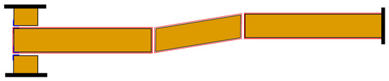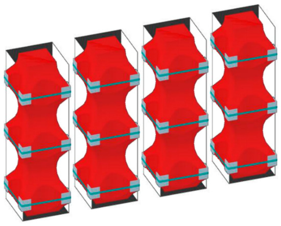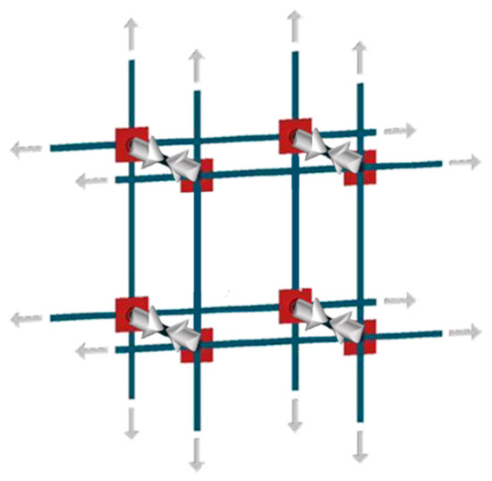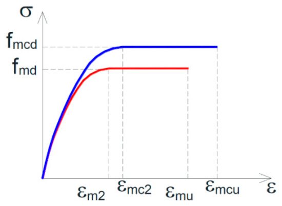 To be precise, the compressive stress in the longitudinal direction of the masonry wall does not increase due to the longitudinal ribbons, but increases, slightly, due to the impeded expansion in the longitudinal direction (Poisson effect) when the compressive stress increases in the transverse direction of the wall (due to the transverse ribbons). In other words, it is possible to evaluate the stress increase in the longitudinal direction (useful to calculate ) only by abandoning the simplified model with single masonry columns in Figure 28 and taking into account the mutual constraints between adjacent masonry units. In any case, the stress increase in the longitudinal direction due to the Poisson effect is lower than the stress provided by the longitudinal straps in the model with single masonry columns.