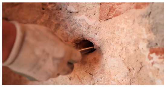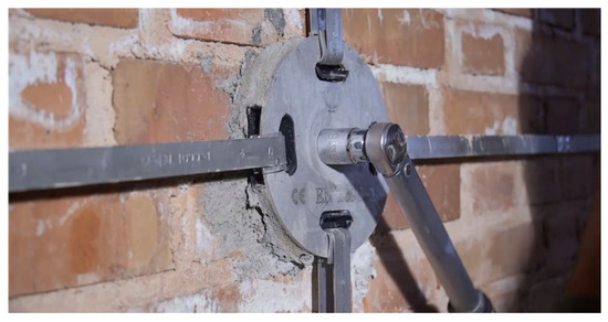 Depending on the aesthetical and architectural characteristics to preserve, it is preferable to install the tie-bars inside, rather than outside the masonry elements. In existing structures, the housing of internal tie-bars is made by drilling the walls (Figure 4 [22]) while, in new buildings, it is made by anchoring one end of a high-tensile steel rod, applying any additional corrosion protection and building the brickwork section around it [31]. One of the main advantages of internal arrangements is that they protect steel against corrosion. In the case of external arrangements, the tie-bars run near the walls or in grooves cut on the wall surface. When the vertical tie-bars are external and unbounded, they are discretely located at the wall corners or next to buttresses (Figure 5) such that architectural impacts can be minimized [32].