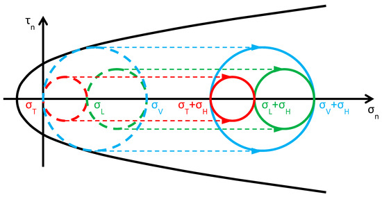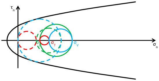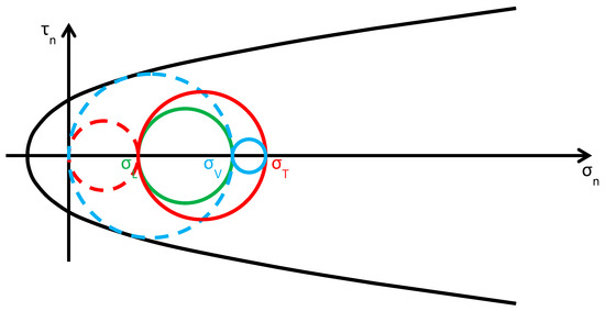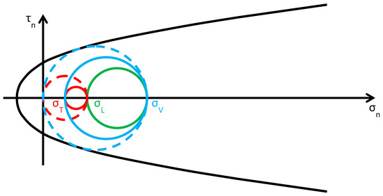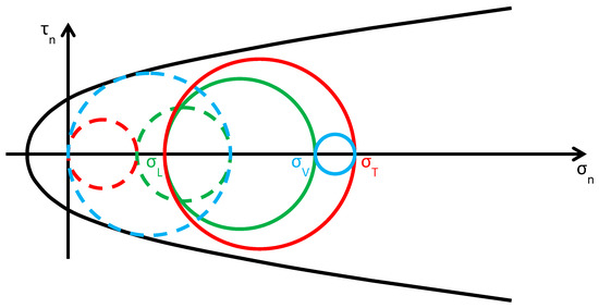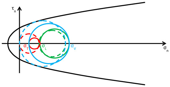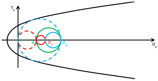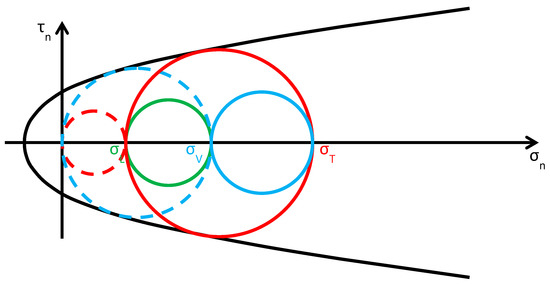 Figure 16. Stress analysis in the plane of Mohr/Coulomb after retrofitting, for (Mohr’s circles before retrofitting in dashed lines, for comparison). - (Figure 17): the greatest circle is associated with the plane (green circle). When the out-of-plane compression, , increases from the value to the value (in absolute value), the radius of the red circle increases while the radius of the blue circle decreases. It could seem that the safety factor does not change in this interval: since the radius of the greatest (green) circle does not modify, the safety factor does not seem to depend on the value of . In fact, the discussion about the safety factor is a bit more complex. As a matter of fact, retrofitting the masonry wall modifies the overall behavior of the wall, that is, modifies the limit surface, all the more greater as the stress of the threaded bars increases. The new limit surface is a combination of the two limit surfaces of masonry and steel. Thus, it seems reasonable that the new limit surface is wider and flatter than the limit surface in Figure 17. In conclusion, if computed as the minimum distance between the greatest circle and the combined limit surface, the safety factor slightly increases even in this interval. At the end of the interval, when , the red circle superimposes onto the green circle and the blue circle degenerates into a point.