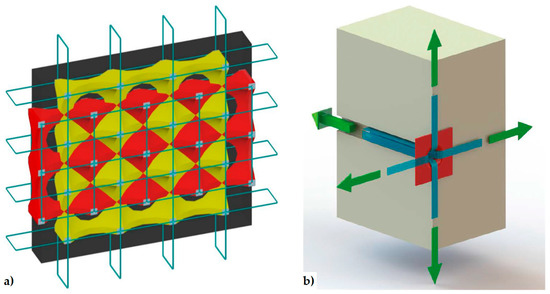 For the sake of simplicity, the authors assumed that the stress in the ribbons is equal to zero and the transverse stress is constant, applied continuously to the wall by the retrofitting system. In these assumptions, each infinitesimal volume of the masonry wall is stressed as shown in Figure 15a, where is the transverse stress (out-of-plane stress provided by the retrofitting system), is the vertical stress (due to self-weight), and is the lateral stress (function of by means of Poisson’s ratio).