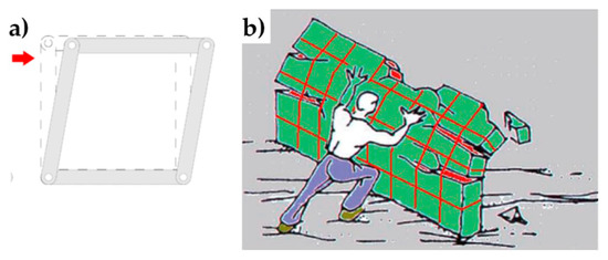 Furthermore, an extensive experimental program on the load-bearing capacity of masonry walls strengthened by steel straps at different pre-tension stresses could be useful to support the theoretical findings of the Mohr/Coulomb stress analysis. However, a careful analysis of the structural scheme made by the steel ribbons led the authors to consider another experimentation on the CAM system to be more urgent. In fact, as discussed in [49,69] for the CAM system, the structural scheme of the rectangular strap arrangement is labile both in the plane and the thickness of the wall, because the vertical loops form unbraced rectangular frame structures with hinged nodes (Figure 32a). While it is possible to find some solution to avoid the lability in the wall plane [49,69], the vertical rectangular loops in the wall thickness are not able to counteract the out-of-plane loads and sway laterally in any case (Figure 32b). Consequently, while both continuous retrofitting systems are effective in increasing the ultimate load of walls subjected to in-plane loading (for the CAM system, see for example [1,2]), they are almost at all ineffective in improving the out-of-plane strength of walls.