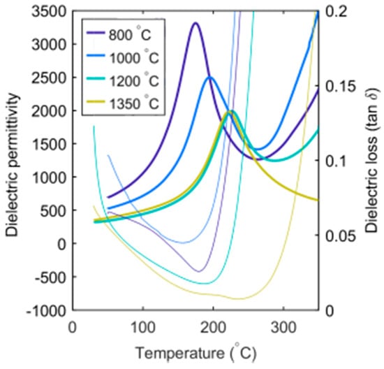 Dielectric permittivity (thick lines) and loss (thin lines) of SBN33 quenched from four different heat treatment temperatures at 1000 Hz. Note that the samples heat treated at 1200 and 1350 °C have been reoxidized.