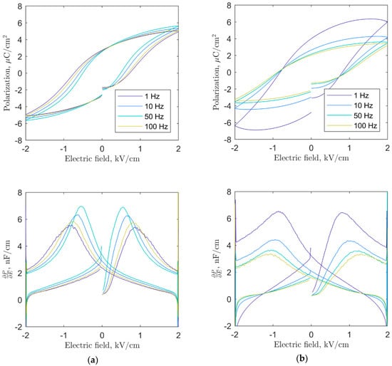 Ferroelectric hysteresis measurements were performed on the SBN33 ceramics with gold sputtered electrodes, using the Piezoelectric Evaluation System aixPES (aixACCT, Aachen, Germany). The samples were measured at 1, 10, 50, and 100 Hz, with steps of 200 V/mm.