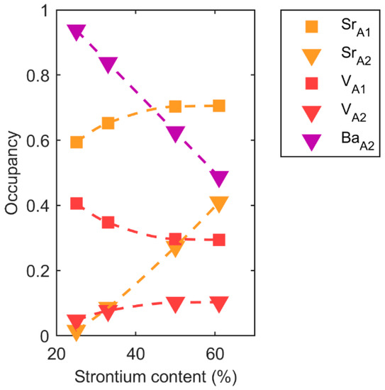 With increasing Sr content, the lattice parameters decreased, the vacancy moved from A1 to A2, and the Curie temperature decreased, as reported previously [3]. The compositional variation in the c parameter, shown in Figure 4, followed Vegard’s law and was not strongly dependent on cation distribution on the A1 and A2 sites. It was mostly influenced by the average cation size determined by the Sr content. On the other hand, the a lattice parameter had a strongly non-linear behavior because it was more influenced by the population of Sr and vacancies on the A1 and A2 sites. The cation population on the two sites depended on the Sr content, as shown in Figure 5a. It is interesting to note that the vacancy concentration on the A2 sites converged towards a constant value on increasing Sr content; the vacancy never completely moved to the A2 site as predicted by DFT [7]. This is because the temperature where complete site order was expected was too low for the cations to be mobile [12]. The Curie temperature decreased with smaller average A cation size because the octahedra tilt to optimize the coordination of the smaller cation, and this tilt coupled to and suppressed the second-order Jahn–Teller distortion, causing ferroelectric polarization [16]. Finally, the incommensurate modulations found in the ab plane in the SBN system may also contribute to the non-linear composition dependence of the a parameter.